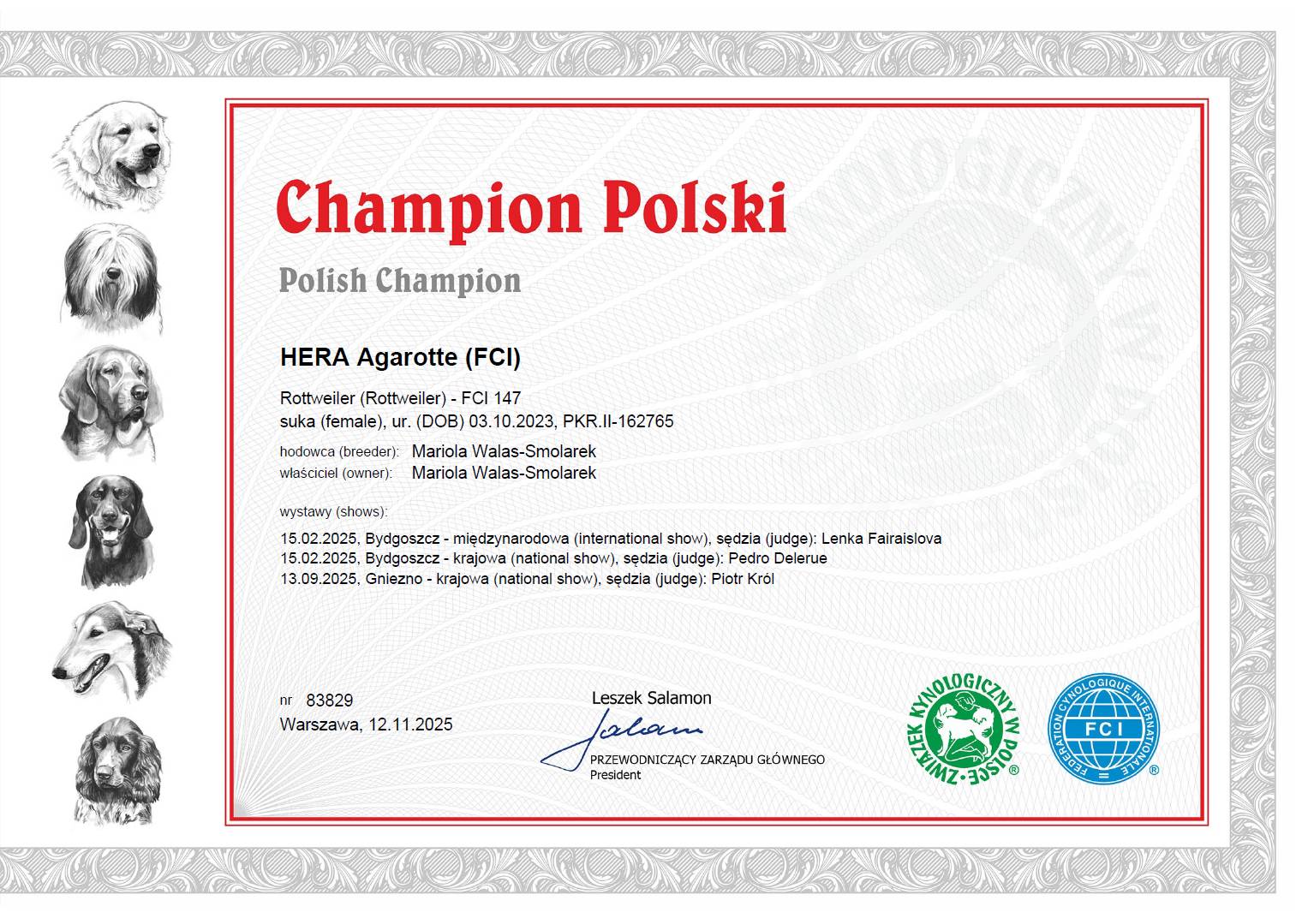 Wysoka suka o mocnej, harmonijnej budowie i pięknej, wyrazistej głowie. Ojcem jest najbardziej utytułowany pies w Polsce – RAMZES Kwanita, a matką nasza TIGA, posiadaczka tytułów Młodzieżowego i Dorosłego Championa Polski. Sama HERA również zdobyła te wyróżnienia oraz m.in. prestiżowy tytuł „Zwycięzca Rasy”. Pochodzi z prestiżowej linii hodowlanej, w której nie brakuje wielu utytułowanych championów, w tym także zwycięzców świata. Jej znakomity rodowód gwarantuje zdrowie, wytrzymałość i doskonałe cechy użytkowe przyszłych pokoleń, a także kontynuację tradycyjnej linii hodowlanej, zachowującej klasyczny wygląd rasy, harmonijną budowę, mocny kościec i zrównoważony charakter.